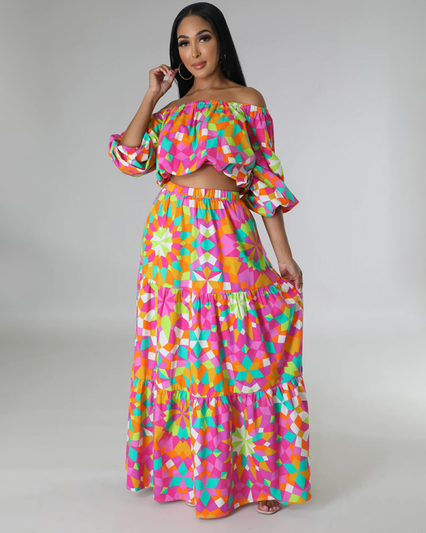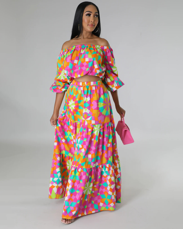 DETAILS 100% polyester Two piece set Crop top Off shoulder Long sleeve No closure High waisted skirt Elastic waistband No closure Hand wash cold The model is wearing a small Size(in) Bust Waist Hips Length XS Updating S M L XL 2XL 3XL 4XL